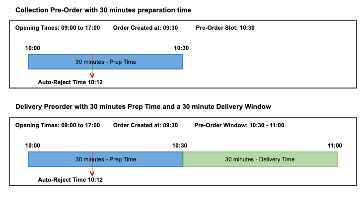 Preorders will automatically reject 18 minutes before the order is due for collection or delivery unless this would mean the order would reject before the start of your preparation time. If this is the case then the order will automatically reject 5 minutes after the start of the preparation time.