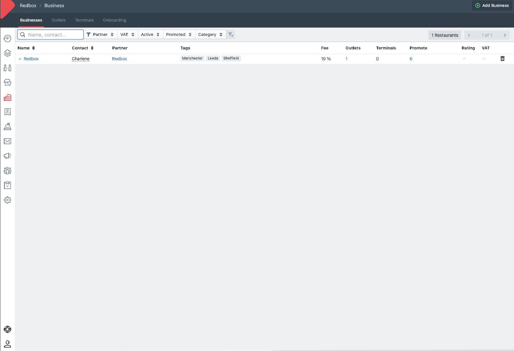 You can manage each of your businesses on your marketplace via Redbox Management, just navigate to the Businesses tab in the main navigation. All your businesses will be listed here, just click on the business you would like to manage.