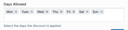 If your outlet receives preorders it is advisable to not use discounts that are applied to specific days and to instead use discounts that apply every day of the week. To create a discount that applies every day of the week ensure all days are selected when creating your new discount.