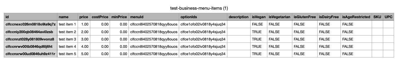 isVegan | Allergy tag, enabled (TRUE) or disabled (FALSE) | TRUE or FALSE - if left blank, the field will default to FALSE |