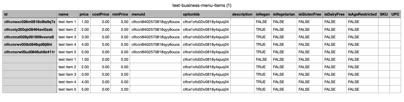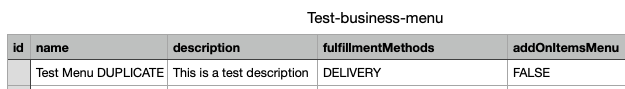 Example of an export file for menu items before menu items are duplicated: