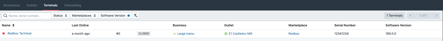 Once on the Terminals tab, this shows a list of all the terminals associated with your marketplace. Software Versions display the versions each terminal is currently on.