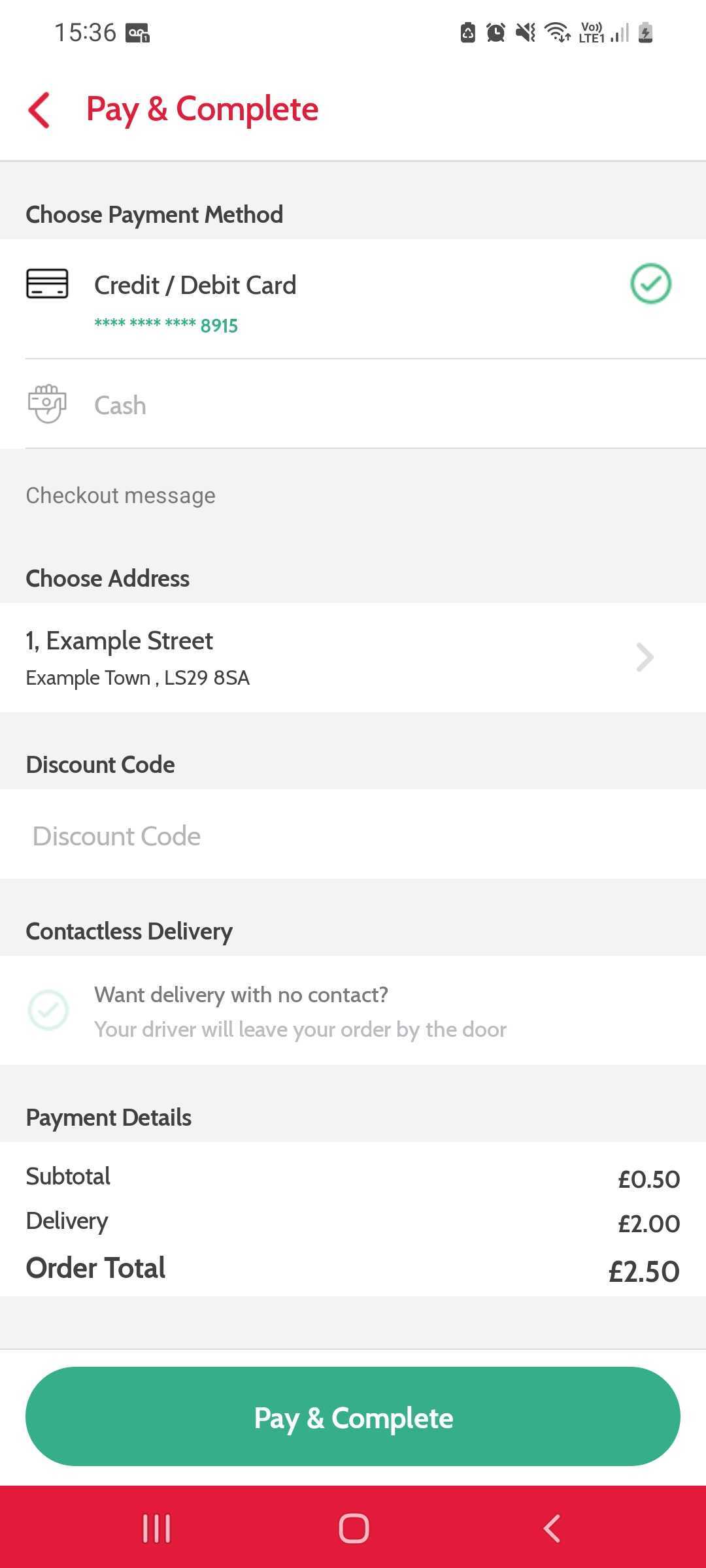 Ordering App (Android device) - Pay and complete screen