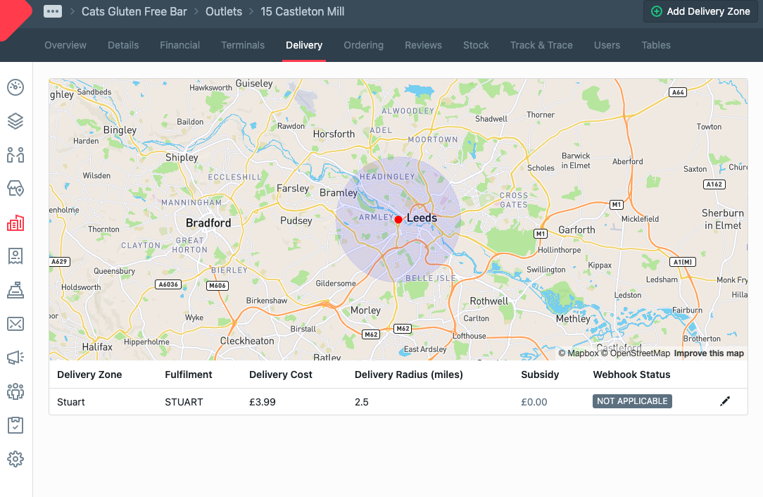 Save, the delivery zone will be saved and the Webhook Status will be NOT APPLICABLE as this outlet is using a central Stuart account.